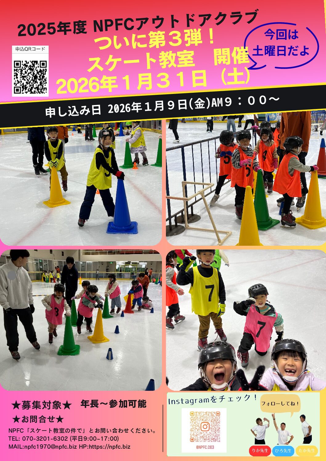 2026.1.19 大切なお知らせ 1月アウトドアクラブ「スケート教室」参加者確認要項 1月31日(土)に開催の「1月アウトドアクラブ」スケート教室にお申し込みの皆様へのご案内です。 参加にあたって下記詳細要項を確認ください。 1月スケート参加者確認要項